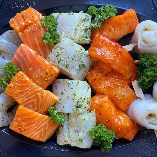 4x KNOFLOOKGAMBA'S 4 x GEMARINEERDE ZALM 4 x KABELJAUW GEMARINEERD